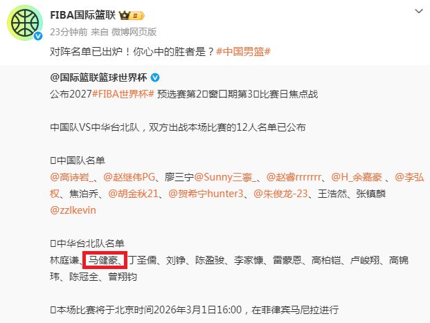 双方的12人名单出炉,中国男篮延续上一场的12人名单,胡明轩与赵嘉义依然落选无缘出战。至于中国台北男篮换了一人,韧带撕裂受伤的马建豪无缘参赛,由游艾喆顶替,因而此前FIBA世界杯官方社媒发布的名单有误,随后中国台北男篮官方修改为游艾喆参赛。