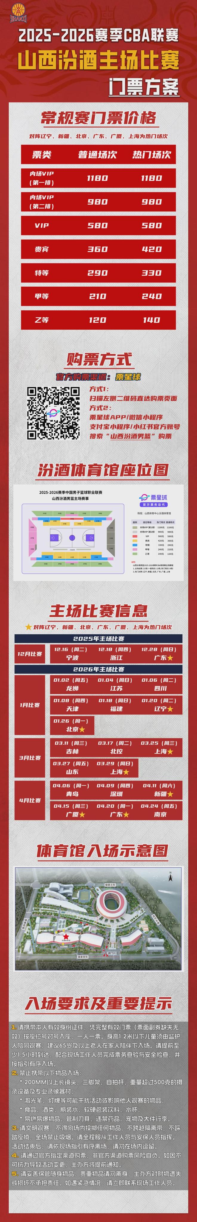 CBA联赛战火再起,山西汾酒蓄势待发!新春短暂休整后,常规赛第二阶段将于3月11日正式开始,山西汾酒将在3月迎来5轮主场赛事,属于我们的战斗,即将拉开序幕!相关赛事门票将于3月1日10时正式开售,请球迷朋友们锁定官方票务平台“票星球”,相聚主场为山西汾酒男篮加油助威。