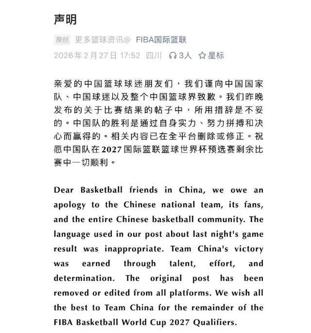 与此同时,FIBA的道歉,来得迟,但总算来了。