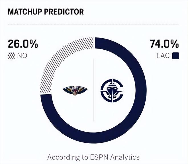 而鹈鹕这边,近期伴随伤员的逐渐回归,他们有10人以上的轮换可以选择,上一战击败爵士后,鹈鹕拿到3连胜,以19胜42负的战绩位列西部倒数第三,对阵爵士的比赛,锡安受伤提前退场,但贝表现出色拿到24分5篮板6助攻的全面数据,琼斯得到17分8篮板7助攻,费尔斯也拿到18分11篮板5助攻。在自身选秀权在其他球队手中的情况下,鹈鹕没有必要摆烂,他们也具备爆冷击败强队的实力!不过由于锡安此役缺阵,ESPN预测本场比赛,鹈鹕胜率跌至26.0%,快船胜率高达74.0%。