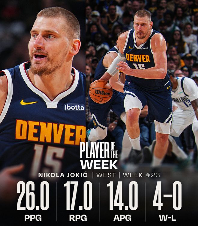 对阵太阳一战,约基奇23分17篮板17助攻,成为NBA历史上第12位单场砍下17+分、17+篮板、17+助攻的球员,这也是他职业生涯第三次达成这一成就。对阵独行侠一战,他砍下23分21篮板19助攻1抢断,成为NBA历史上首位连续两场比赛斩获20+分、17+篮板、17+助攻的球员。对阵爵士一战,他贡献33分16篮板12助攻1抢断,拿下本周第三次三双。对阵勇士一战,他砍下全场最高的25分15篮板8助攻1抢断。