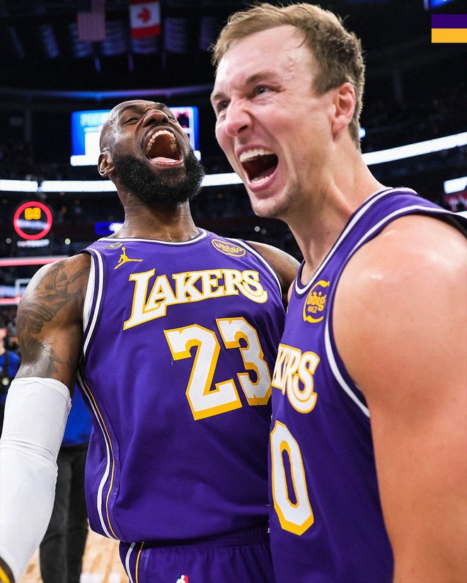 湖人队首发阵容:东契奇、里夫斯、拉拉维亚、勒布朗、海耶斯