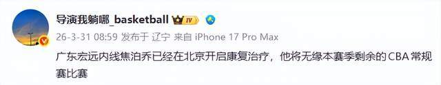 北京时间3月31日消息,广东男篮内线焦泊乔,已正式确认无缘本赛季剩余所有比赛——不是因伤,而是因“心病”。