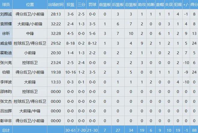 广州队只有三人得分上双,徐昕贡献13分10板2助6帽全面数据难救主。