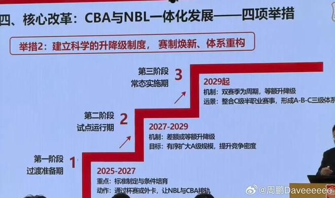 本周,官方召开会议,其中关于未来联赛格局成为重点,也就是大家所说的“升降级”,和此前全明星周末期间进行的CBA投资人会议讨论的保持一致:2025-2027年为过渡准备期、2027-2029年为试点运营期、2029年起为常态实施期。