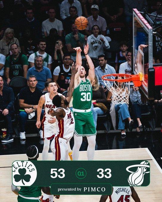 凯尔特人首节28中20超过7成准星,其中三分15中11超过7成准星,首节已经53-33领先热火20分巨大优势。