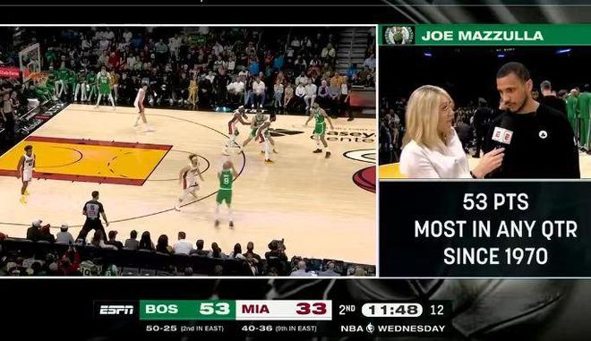 凯尔特人单节狂轰53+11三分的超级表现,创造队史自从1970年后,最近56年单节最高得分纪录。