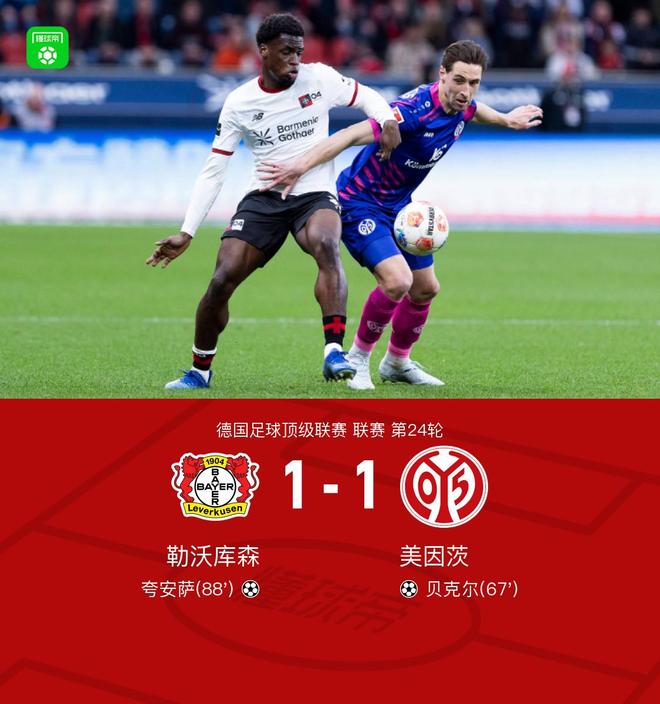 北京时间2月28日德国足球顶级联赛 联赛 第24轮,勒沃库森主场对阵美因茨。勒沃库森夸安萨破门。美因茨贝克尔破门。最终比分勒沃库森 1-1 美因茨。