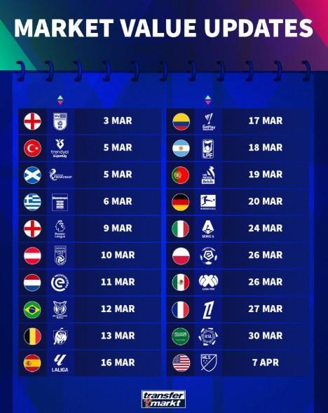 北京时间2月28日凌晨,德国转会市场公布了各联赛球员最新一期身价的更新时间,其中英超将在3月9日公布,西甲在3月16日公布,德甲在3月20日公布,意甲在3月24日公布,法甲在3月27日公布。