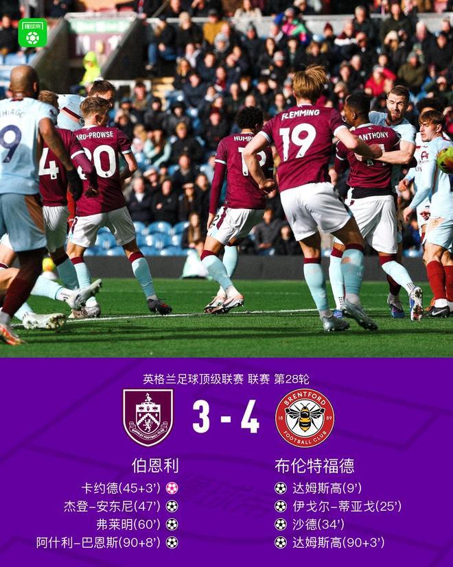 北京时间2月28日英格兰足球顶级联赛 联赛 第28轮,伯恩利主场对阵布伦特福德。伯恩利杰登-安东尼破门,弗莱明破门,阿什利-巴恩斯破门。布伦特福德达姆斯高梅开二度,伊戈尔-蒂亚戈破门,沙德破门,卡约德自摆乌龙。最终比分伯恩利 3-4 布伦特福德。