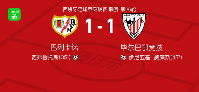 北京时间2月28日西班牙足球甲级联赛 联赛 第26轮,巴列卡诺主场对阵毕尔巴鄂竞技。巴列卡诺德弗鲁托斯破门。毕尔巴鄂竞技伊尼亚基-威廉斯破门。最终比分巴列卡诺 1-1 毕尔巴鄂竞技。