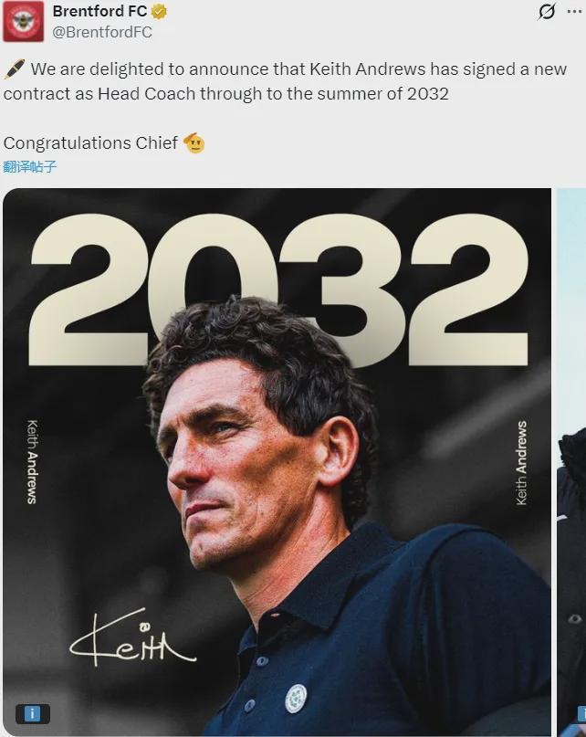官方:布伦特福德宣布和主帅凯斯-安德鲁斯续约到了2032年。