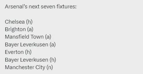 阿森纳未来7场比赛:主战切尔西、客战布莱顿、客战曼斯菲尔德、客战勒沃库森、主战埃弗顿、主战勒沃库森、联赛杯决赛对曼城