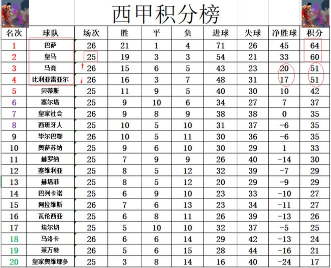 积分榜方面,巴萨今天先赛大胜后,再次将和皇马的差距拉大到4分稳居榜首。比利亚雷亚尔惨败后,基本上可以宣告没有机会追上巴萨了,同时他们还被赢球的马竞以净胜球优势超过,马竞替代黄潜冲进前3。