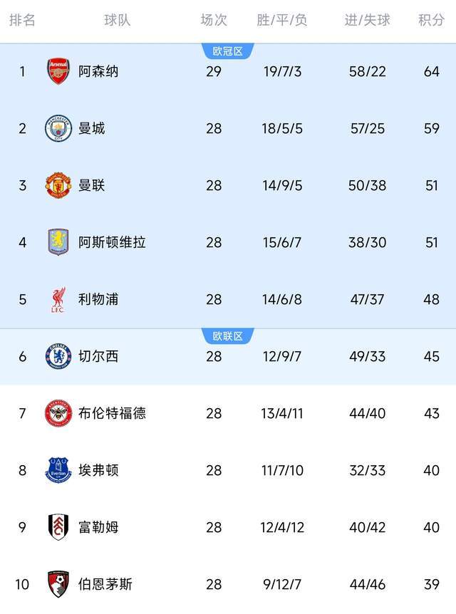 英超一共38轮,还剩最后10轮!冲刺阶段的英超联赛势必将展开更激烈的竞争。而尤其是在欧冠区域。目前,阿森纳多赛一场64分稳居第一,曼城59分紧随其后。曼联冲到第3,和阿斯顿维拉同积51分。利物浦、切尔西位列第5、第6,对于前四的争夺来看,红军和蓝军有些掉队的感觉。