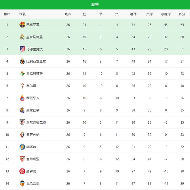 随着皇马0-1爆冷+巴萨笑纳!西甲最新积分榜:1-4名差13分马竞掉队