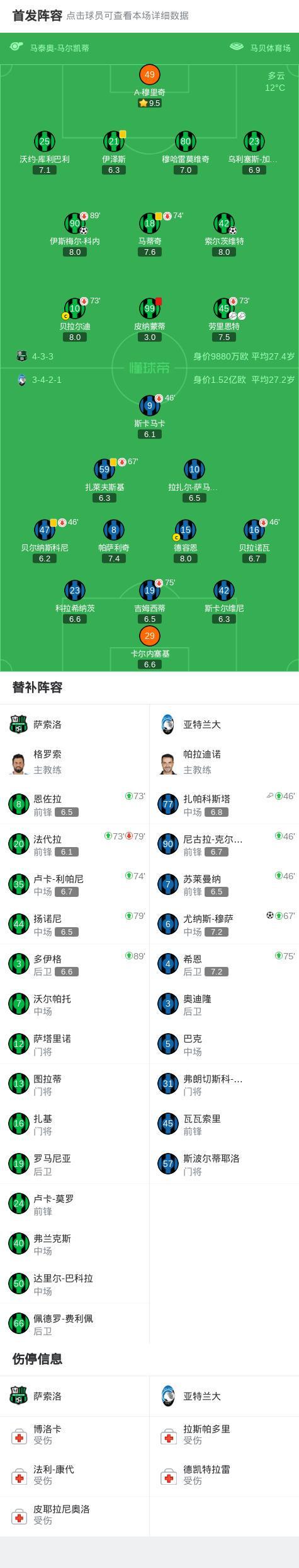 十人萨索洛2-1亚特兰大,索尔茨维特世界波,科内建功,穆萨破门