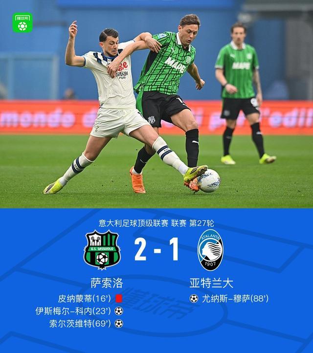 北京时间3月1日意大利足球顶级联赛第27轮,萨索洛主场迎战亚特兰大。比赛中,一名萨索洛球员因违纪被红牌罚下,随后萨索洛凭借两次团队配合,由伊斯梅尔-科内、索尔茨维特先后建功;亚特兰大则在比赛末段通过配合由尤纳斯-穆萨打入一球。最终萨索洛以2-1的比分击败亚特兰大。