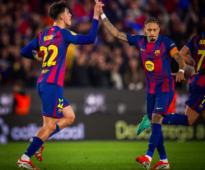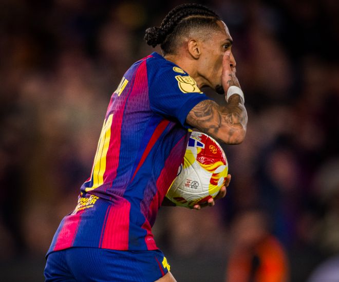 半场结束前,佩德里在禁区内被放倒,裁判果断判罚点球。拉菲尼亚操刀,轻松骗过穆索,弗里克实现了半场追回两球的目标。