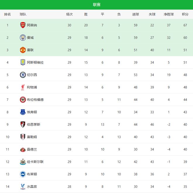 英超第29轮,阿森纳、曼城、切尔西、维拉、森林队等多家豪门联手出击,争冠的、争四的、保级的,几乎所有悬念都在这一轮被重新点燃。先赛的阿森纳客场1-0险胜布莱顿,萨卡打入全场唯一进球,豪取联赛3连胜;切尔西客场4-1逆转阿斯顿维拉,佩德罗上演帽子戏法,蓝军反超利物浦冲上积分榜第五;曼城主场2-2被保级球队诺丁汉森林逼平,爆出超级大冷,在少赛一场的情况下,落后榜首阿森纳7分。
