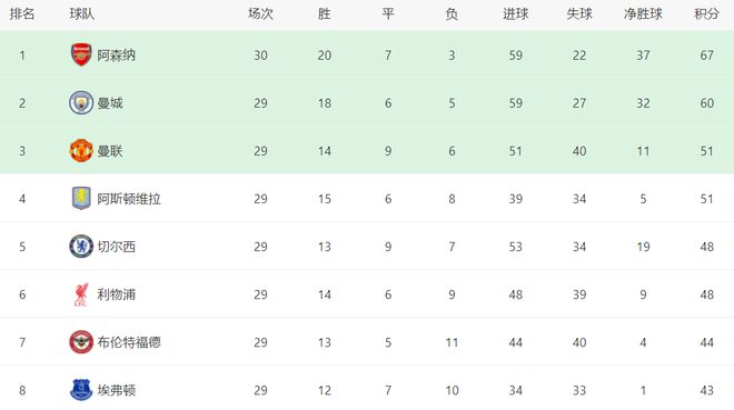 赢下这场比赛,意味着阿森纳在联赛取得一波3连胜。而同时间进行的另一场比赛,曼城意外被诺丁汉森林逼平,丢掉了2分。这两场比赛的结果直接改变了争冠格局。阿森纳总积分达到67分,曼城总积分只有60分。阿森纳足足领先曼城7分。虽然曼城少踢1轮,但在联赛所剩无几的情况下,想要挤掉阿森纳夺冠,难度实在是太高了。