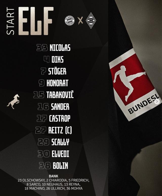 门兴格拉德巴赫:33-莫里茨-尼古拉斯、4-凯文-迪克斯、30-尼科-埃尔维迪、16-桑德尔、17-卡斯特罗普、7-凯文-施特格尔、27-赖茨、29-约瑟夫-斯卡利、38-胡戈-博林、9-奥诺拉、15-哈里斯-塔巴科维奇