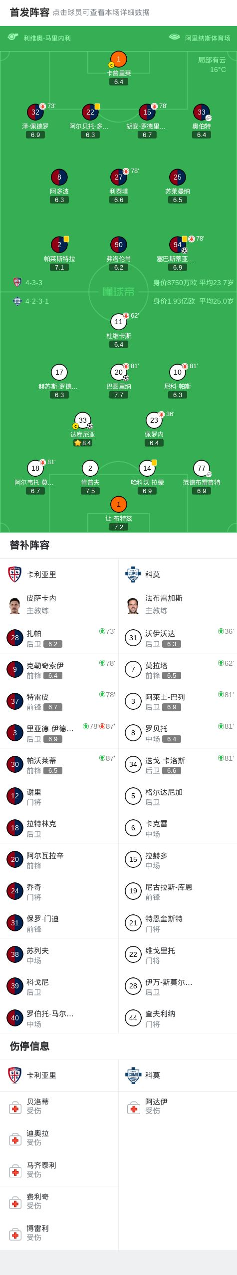 卡利亚里vs科莫:塞巴斯蒂亚诺-埃斯波西托、弗洛伦肖首发,尼科-帕斯、阿尔韦托-莫雷诺出战