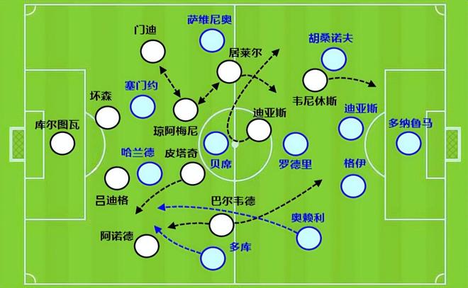 从皇马3比0完胜曼城的比赛布阵中可以看到,阿韦罗亚打造了一个4411体系,韦尼休斯突前,迪亚斯出任前腰。