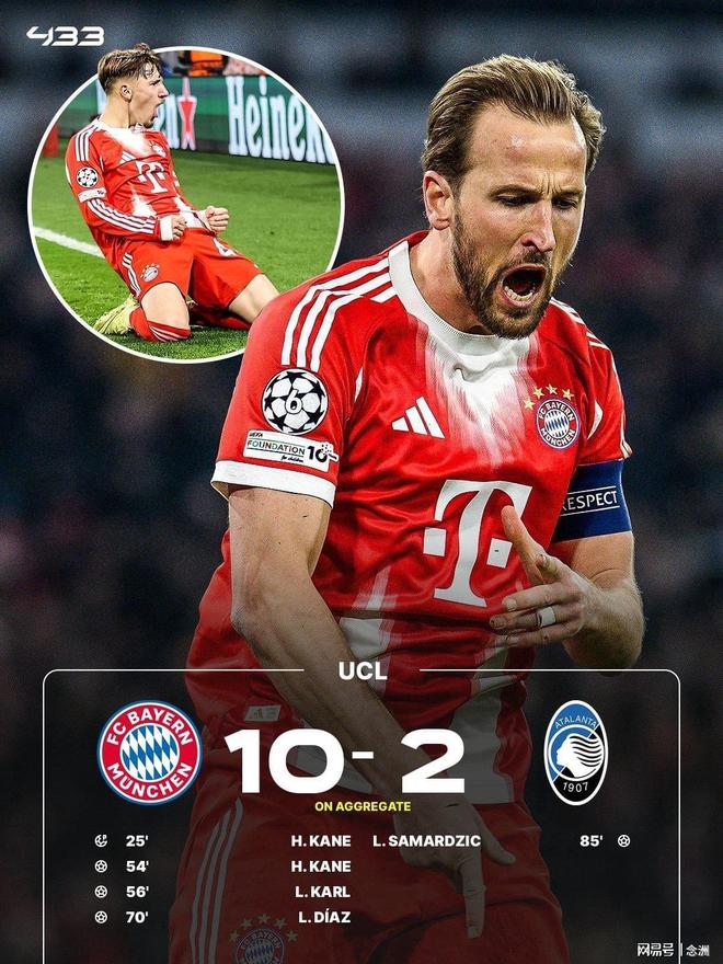 拜仁主场4-1、总比分10-2亚特兰大晋级欧冠八强,将对阵皇马。凯恩造点+点射命中,下半场凯恩再进一球,卡尔、迪亚斯锦上添花,萨马尔季奇扳回一城。