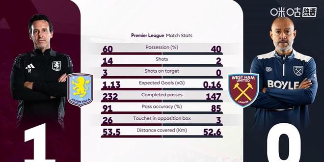 半场结束,维拉暂时主场1-0领先西汉姆联。上半场比赛,维拉狂轰14脚射门3次射正打入1粒进球,埃梅里似乎对于球队的进球转化率不是非常满意,中场休息时表情严肃的走向更衣室。