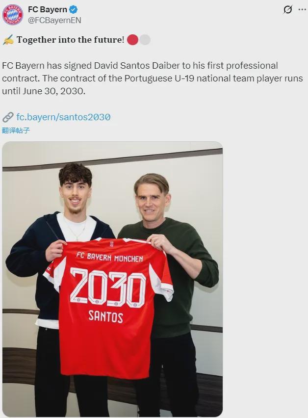 官方:拜仁宣布和新星大卫-桑托斯-戴伯尔签下了他的第一份职业合同,这名19岁中场的新合同2030年到期。
