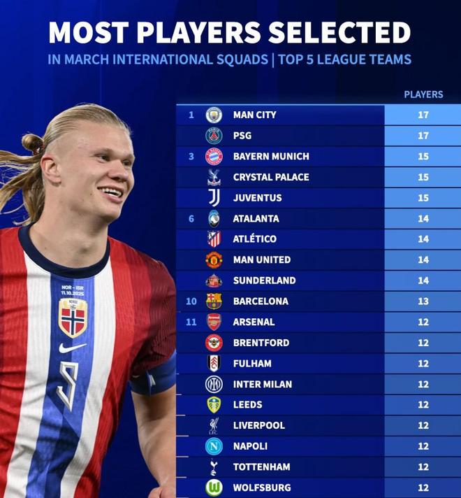 五大联赛球队本月被征召国脚数量:曼城、巴黎17人并列第一