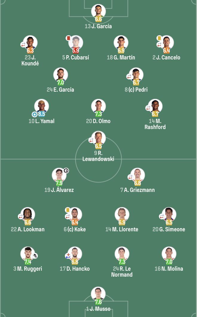 就此比赛走向了西蒙尼控制,巴萨虽然很想扳回一分,可是众志成城下马竞没给机会。亚马尔及坎塞洛们几乎是把边路突出了火星,奈何,马竞防守实在是太好了,就此90分钟,马竞2-0胜的。